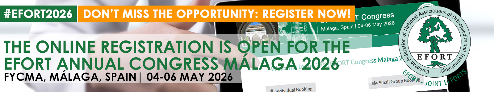As EFORT is the biggest European platform to share orthopaedic and trauma knowledge, an active participation in our upcoming EFORT Annual Congress 2026 in Málaga, Spain, is the best opportunity to identify new data related to any specialty, gather useful tips and tricks to enhance daily medical achievements and expand the professional network.