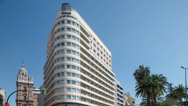 The AC Hotel Málaga Palacio is a modern 4-star hotel located in the city center between Málaga Cathedral and the port, offering easy access to the beach and old town. It features contemporary rooms equipped with air conditioning, flat-screen TVs, workspaces, and free WiFi. The hotel features a terrace with city views, a fitness center, and an on-site restaurant.